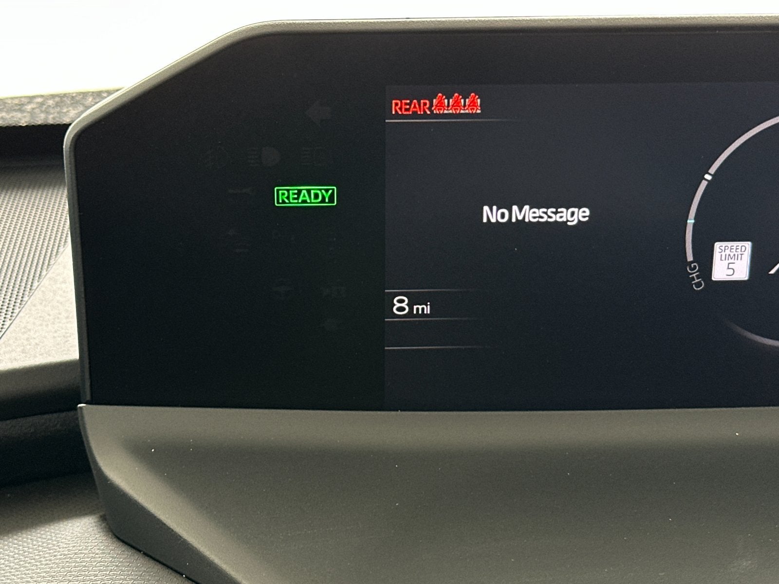 - Top-mount Multi-Information Display (MID) with indicators and 7-in. LCD display with speedometer, charge meter, power output meter, drive mode indicators, instrumentation and customizable settings, odometer, tripmeters, clock, outside temperature, rear passenger seatbelt indicators, fuel economy information, trip timer, charging information and settings, and warning messages
